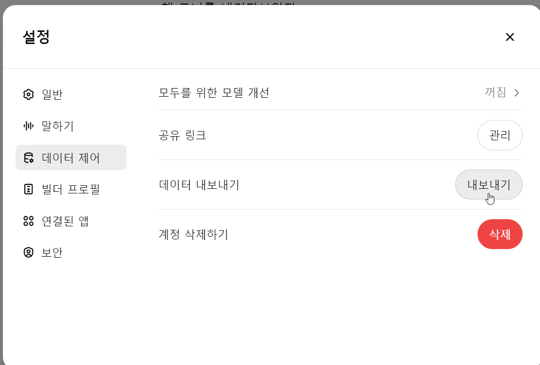 계정아이콘 > 설정 > 데이터 제어 > 데이터 내보내기.