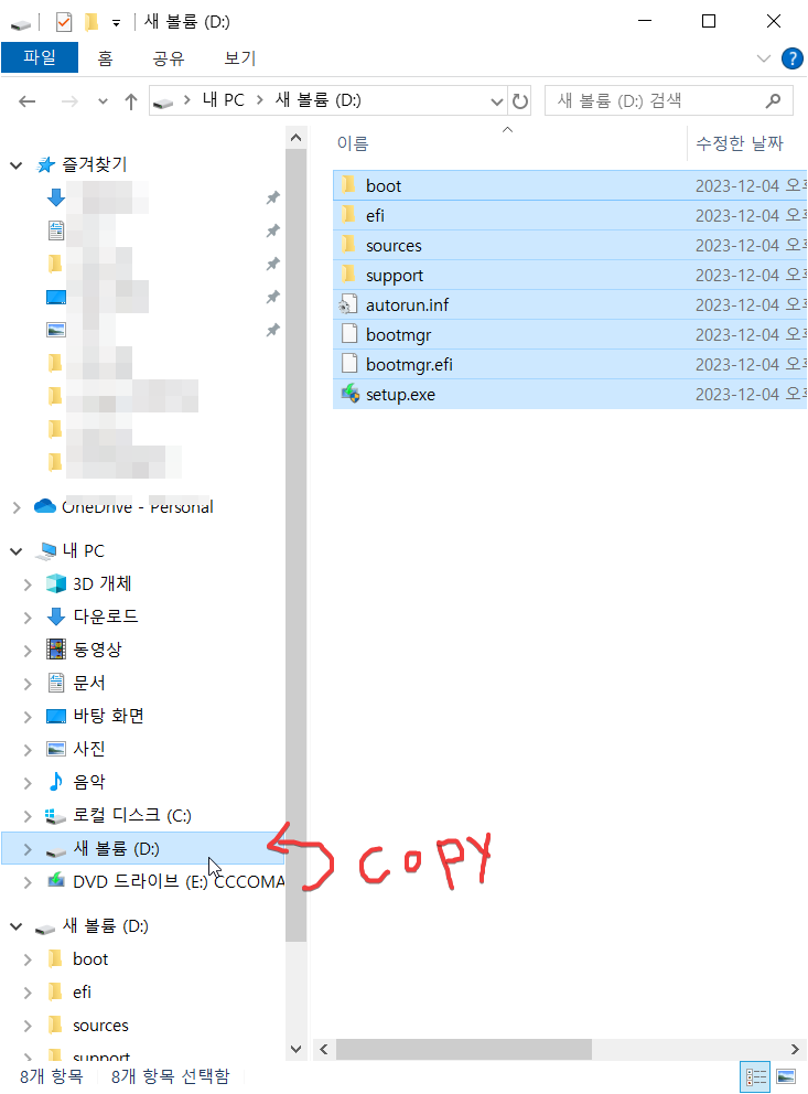 - 파일을 복사한 후, USB 드라이브 루트에 있는 bootmgr 파일과 boot 폴더가 있는지 확인.