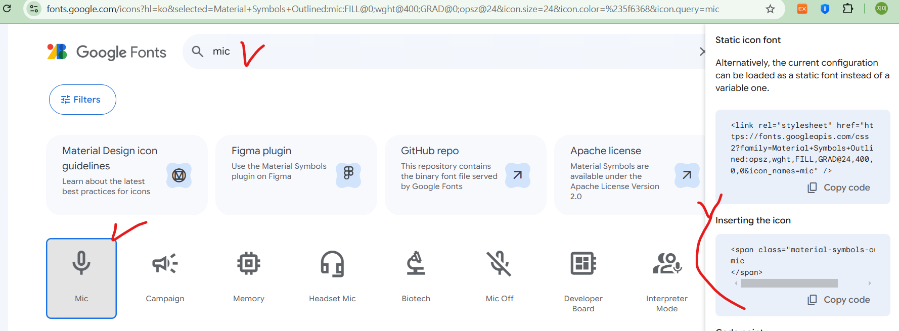 -사용할 아이콘 검색 후 아이콘 insert 할 곳에 'Insert the Icon' 코드 복사 붙여넣기