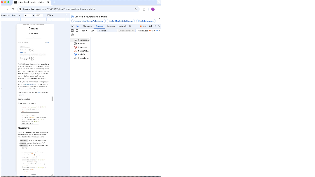 해결: PC 크롬 개발자 도구를 활용하여 모바일 환경을 시뮬레이션하면서 테스트를 진행했다. 개발자 도구에서 디바이스 모드를 활성화하여 터치 이벤트를 검증할 수 있었다.