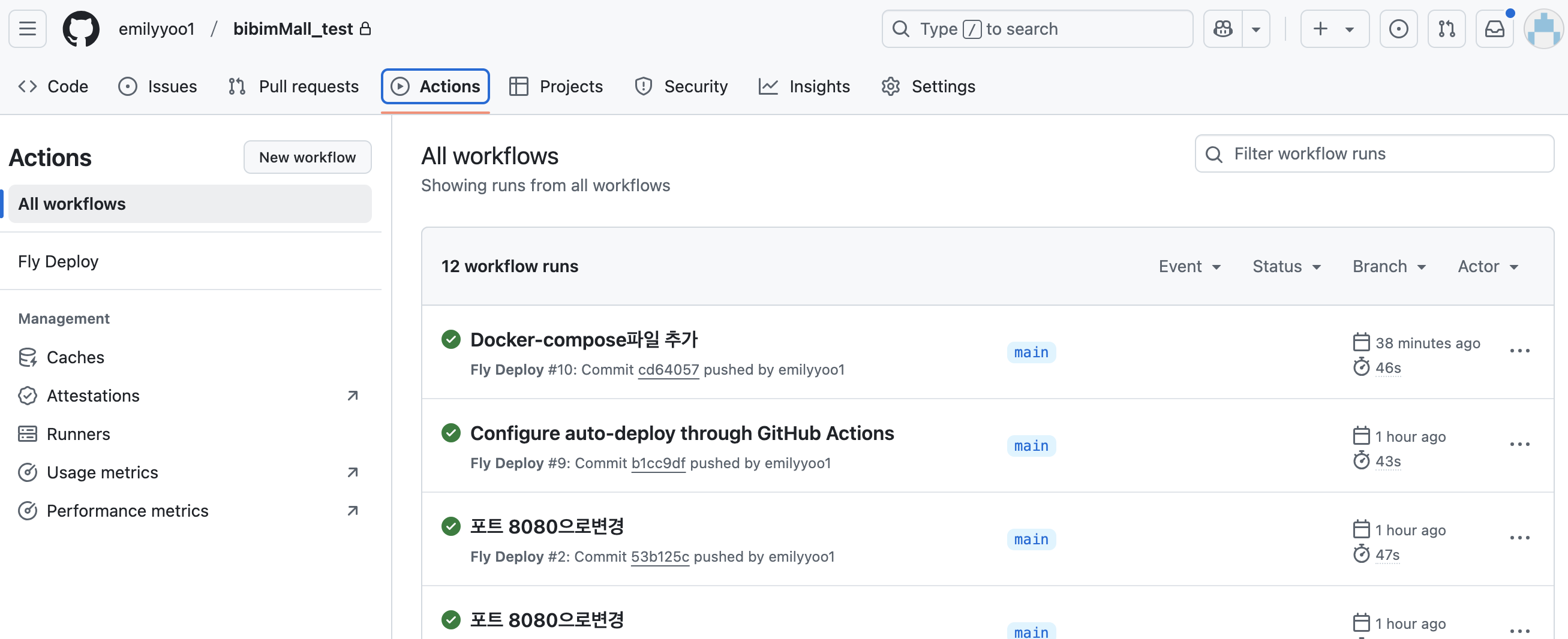 GitHub 리포지토리의 Actions 탭에서 배포 상태를 확인할 수 있다.