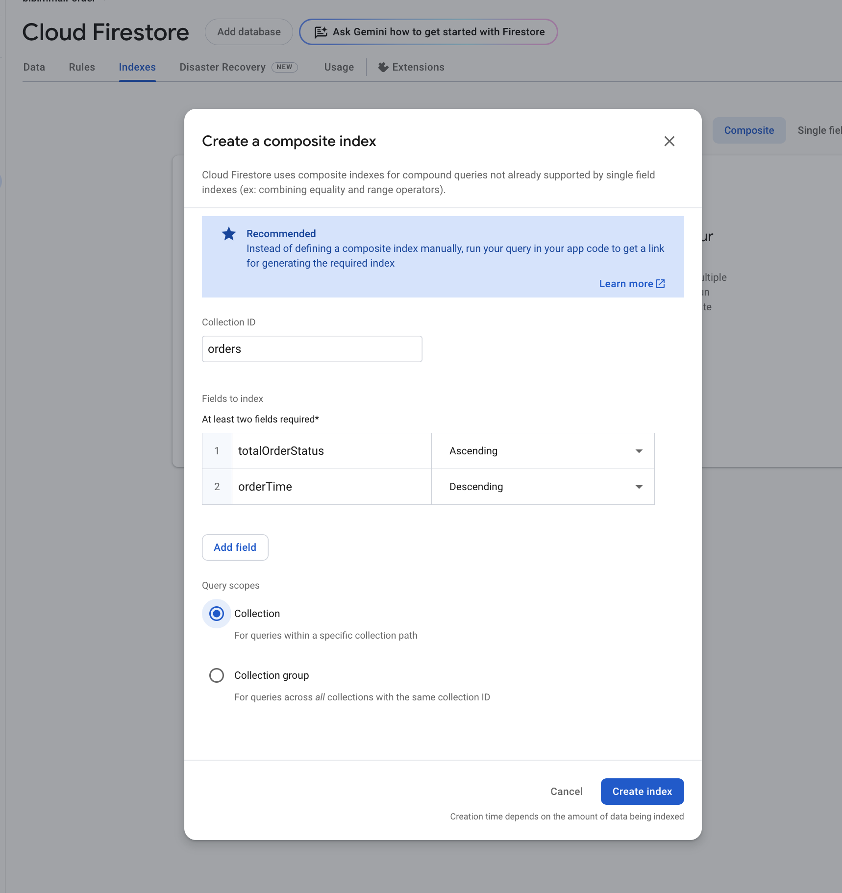 이때, Firestore에서 복합 인덱스가 필요하다.