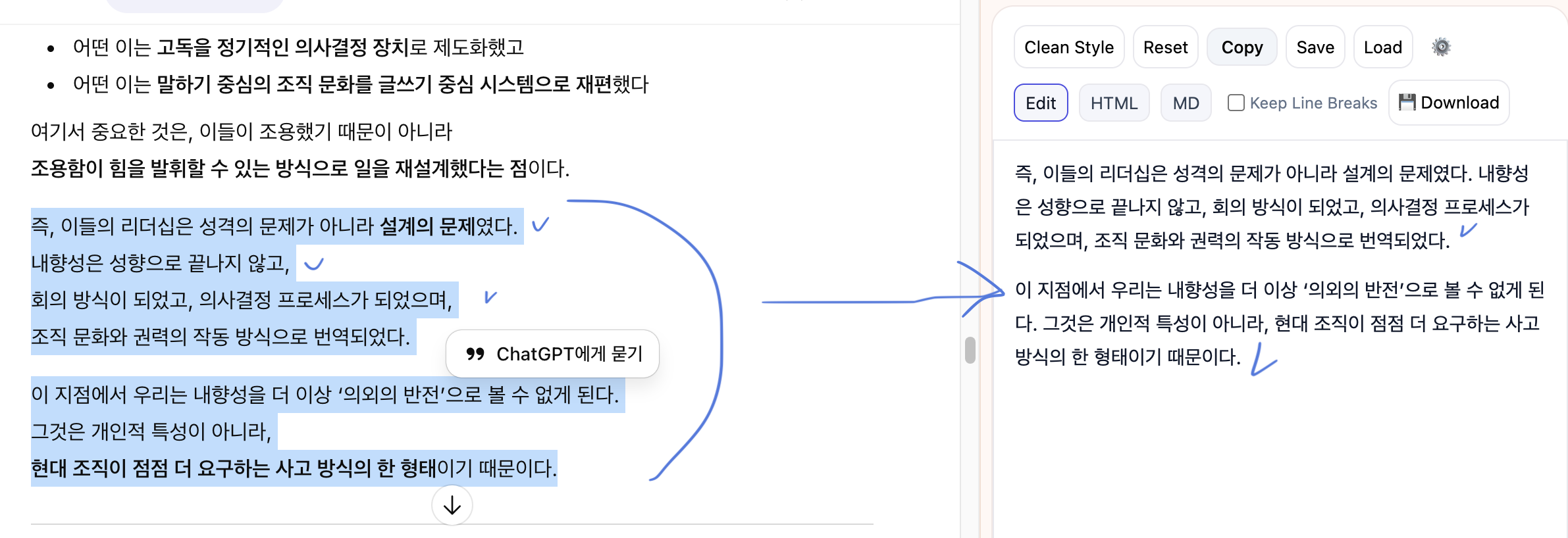 텍스트를 깔끔하게 정리하고 HTML/MD로 변환하는 도구입니다.