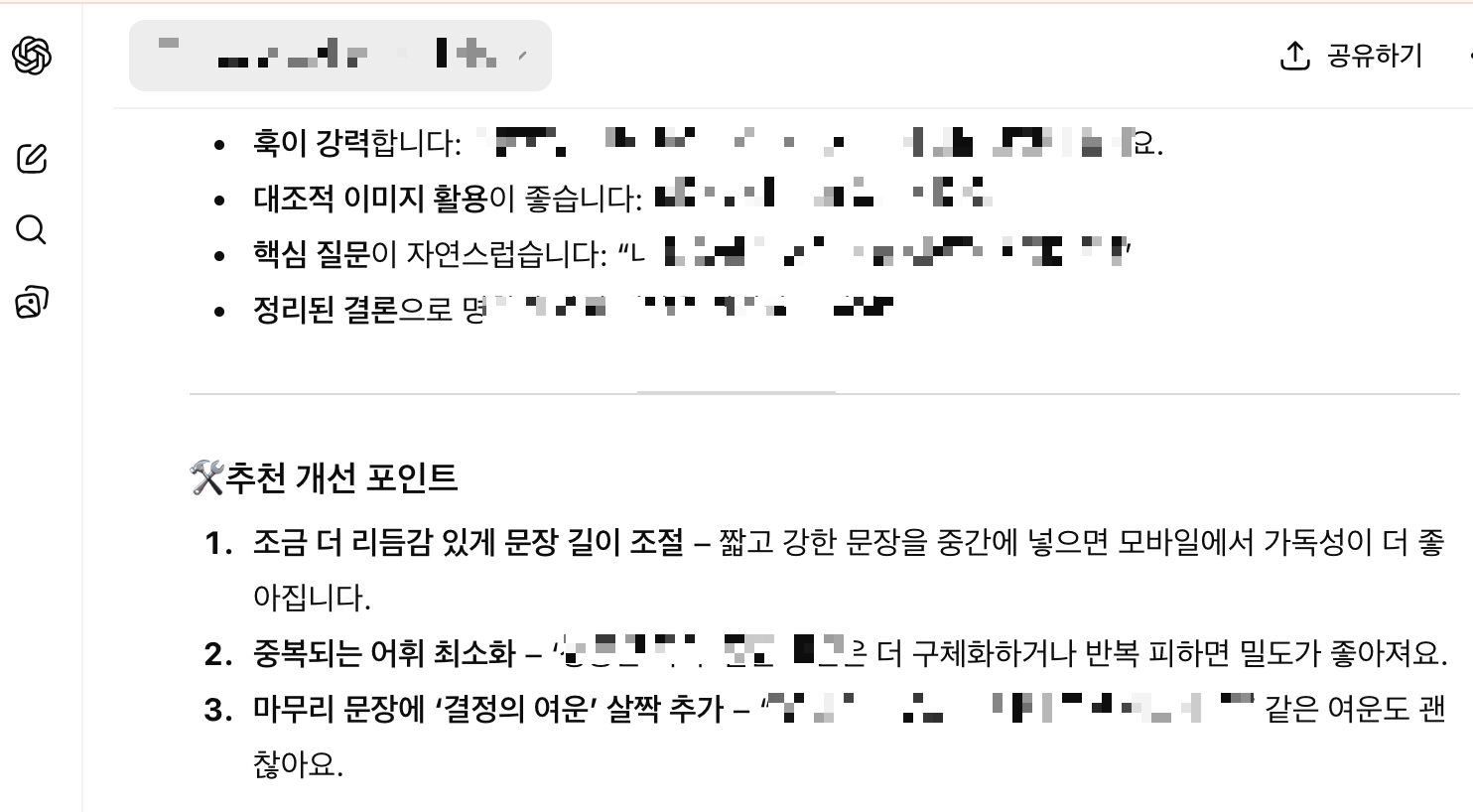 그리고 나같은 경우 꽤 긴 글을 요청할 때도 많은데 그럴 때 챗지피티는 꼭 줄바꿈을 넣는다. 이런걸 그대로 공적인 문서에 붙여넣기에 부자연스럽다.